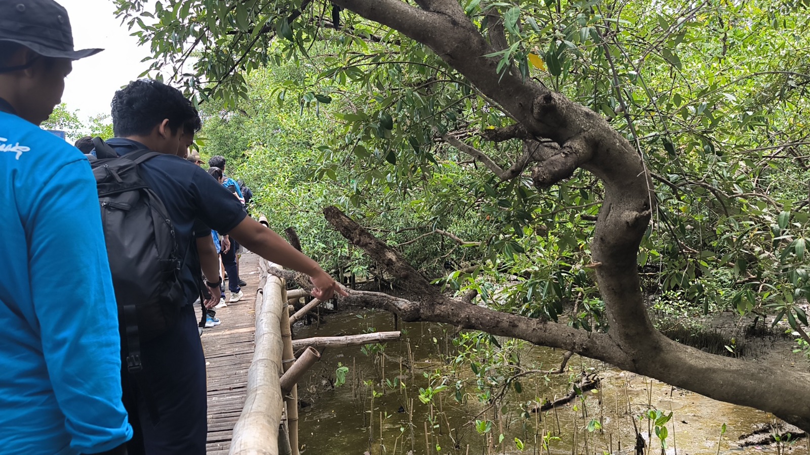 Dalam kegiatan ini, peserta menanam mangrove jenis Rhizophora, salah satu spesies mangrove utama yang berperan penting dalam menjaga stabilitas ekosistem pesisir. Mangrove Rhizophora memiliki ciri khas berupa akar tunjang (stilt root) yang tumbuh mencuat dari batang dan cabang bagian bawah, kemudian menghujam ke dalam tanah. Struktur perakaran ini mampu meredam gelombang, menahan abrasi, serta memperkuat garis pantai.