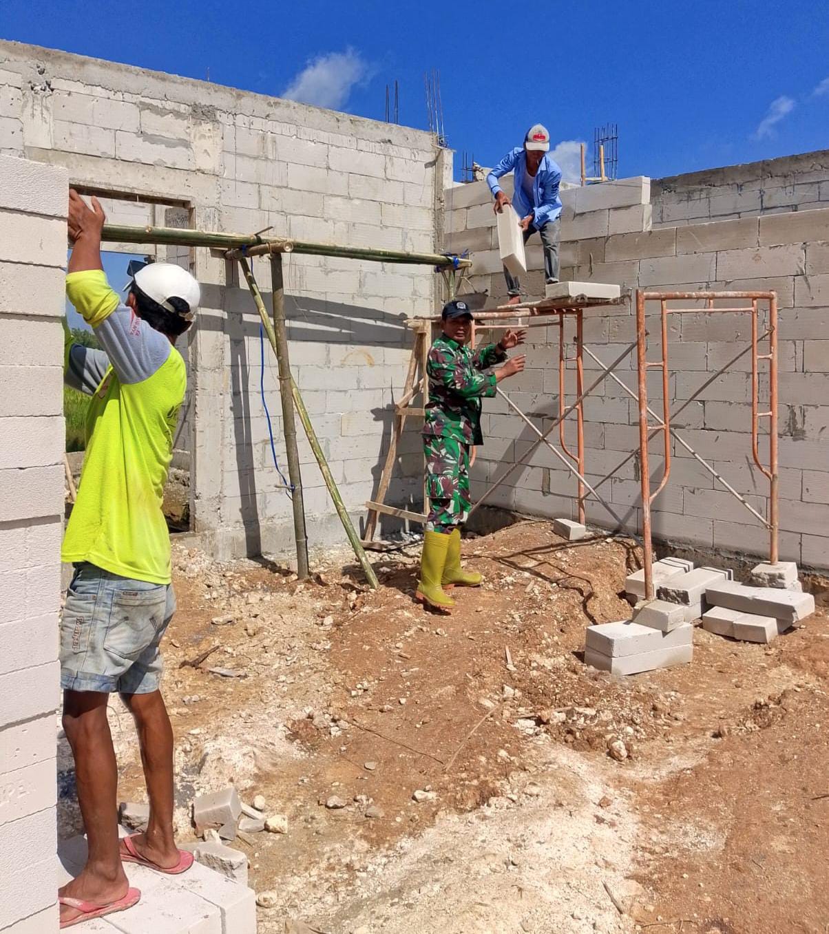 Dalam kegiatan tersebut, Babinsa Desa Banyu Beseh Koramil setempat, Serda Teguh, turun langsung mendampingi proses pengerjaan bersama para pekerja. Kegiatan ini melibatkan satu personel Koramil serta delapan tukang umum yang dipimpin oleh kepala tukang, Bapak Dul, sesuai dengan izin pengerjaan pembangunan KDKMP Desa Banyu Beseh.