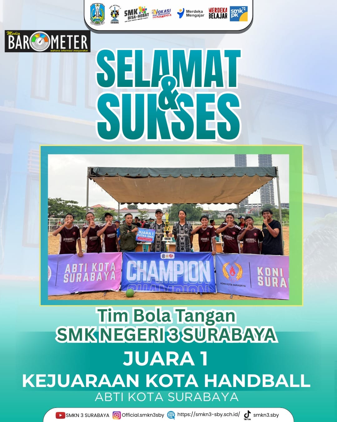 Mutiaranews.com – Surabaya,– Tim Handball SMK Negeri 3 Surabaya berhasil menorehkan prestasi membanggakan dengan meraih Juara 1 Kejuaraan Kota Surabaya yang diselenggarakan oleh Asosiasi Bola Tangan Indonesia (ABTI). Kejuaraan tersebut berlangsung di Lapangan Berkuda Universitas Negeri Surabaya (UNESA) pada 15–20 Desember 2025.